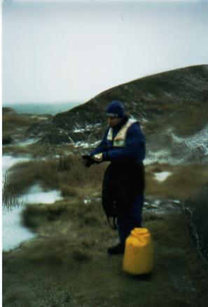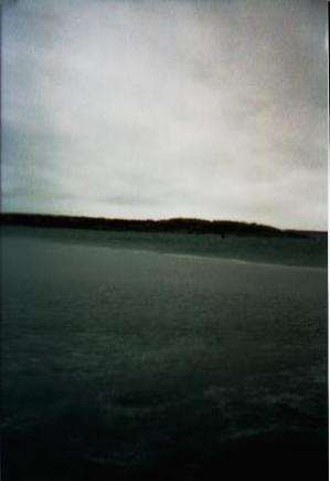 Detta är faktiskt ett kort på Ribbing kämpandes mot vinden, tyvärr är han väl inte mer än ett par enstaka pixlar på bilden. Rutten vi planerat paddla fick kastas ... viken och kanalen var frusen. Den gråa isen (som även syns på bilden) höll inte att gå på så även plan B fick kastas i havet.