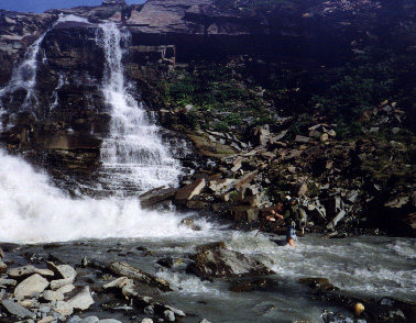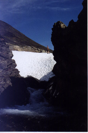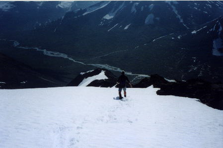 Pucko påväg över en snöbro för att sen bestiga Niak.