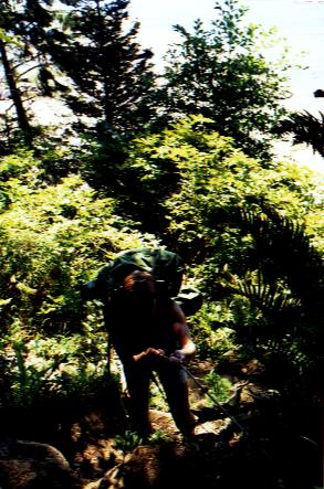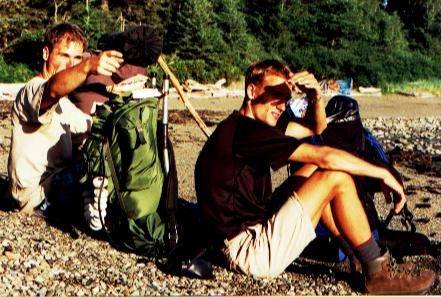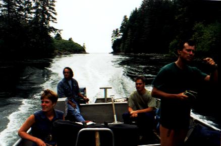 Här tar Indianen oss över tidvattensälven. Det var alltså på högra sidan jag stod ... ..och på vänstra lunkade björnen. Vi såg även en stor famil av Havsuttrar simma förbi - hela tjocka släckten måste ha varit ute på tur! Till höger på bilden står en fransman som vi stött på flera dagar. Han var professor och forskade i FEM-analys för träkonstruk- tioner! Mycket intressant att gå och disskutera om det... :-)